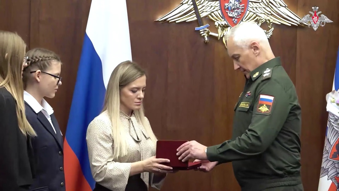 El ministro de Defensa del Rusia, Andréi Beloúsov, entrega la medalla Estrella de Oro de Héroe de la Federación de Rusia a la viuda y las hijas de Konstantín ChirkovMinisterio de Defensa de Rusia